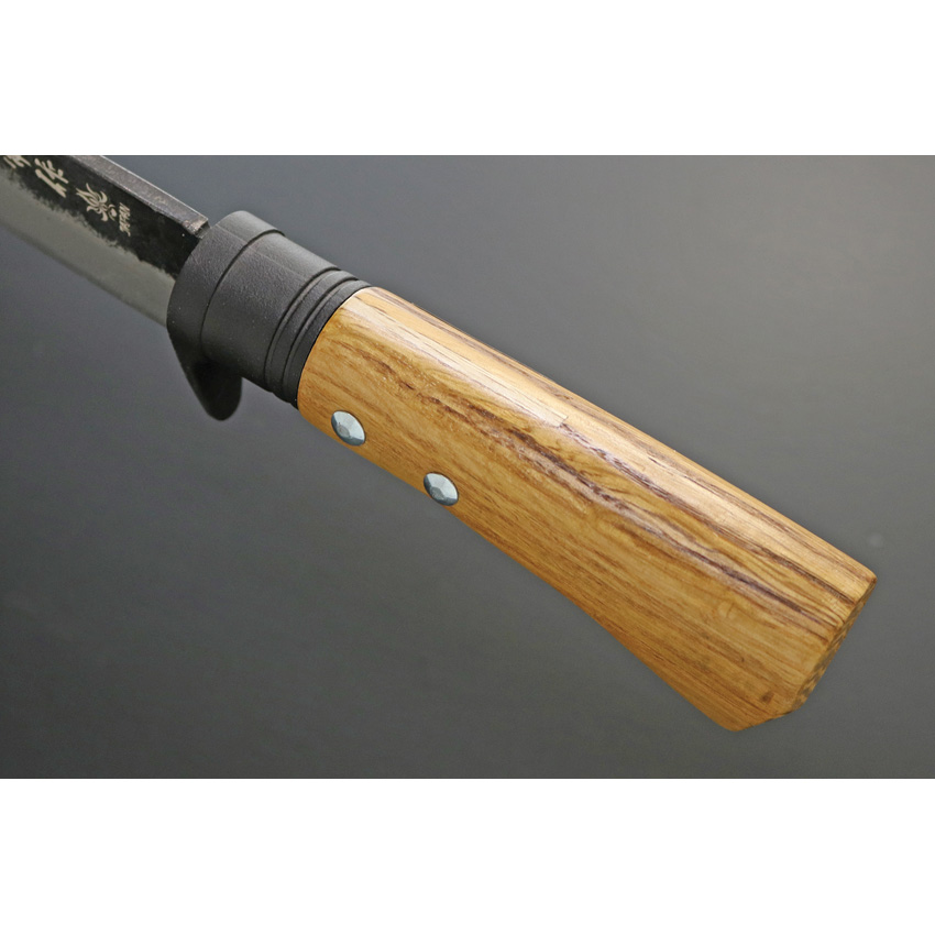 11.25″ (28.58cm) overall. 6″ (15.24cm) blade. Brown wood handle. Steel guard. Classical KURO-UCHI finished blade is Sanmai takefu shiro white #2 core sandwiched by soft iron. Brown leather belt sheath. Boxed.