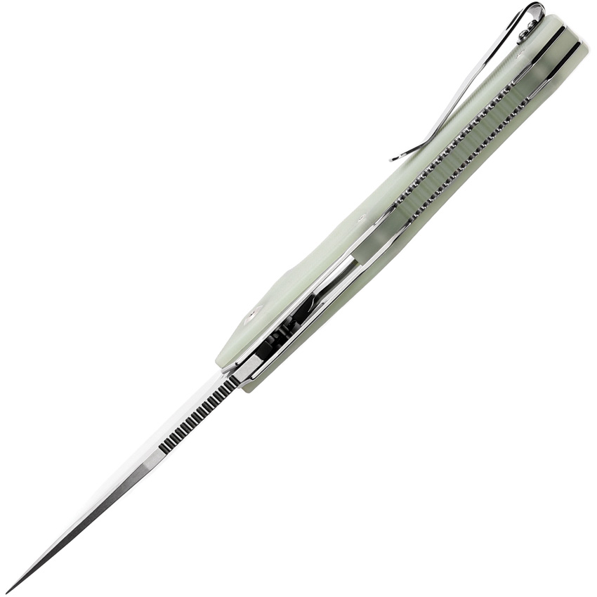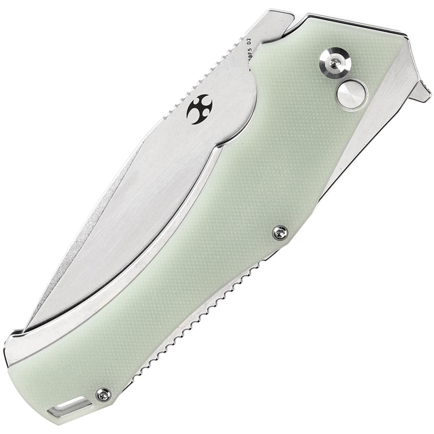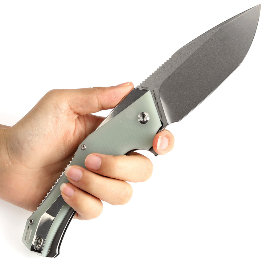 5.25″ (13.34cm) closed. 3.75″ (9.53cm) stonewash finish D2 tool steel blade. Jade G10 handle. Extended tang. Lanyard hole. Pocket clip. Black nylon pouch. Boxed.