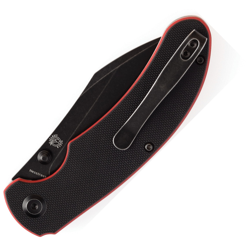 4.5″ (11.43cm) closed. 3.5″ (8.89cm) black stonewash finish 154CM stainless blade. Black and red G10 handle. Thumb stud. Pocket clip. Black nylon pouch. Boxed.