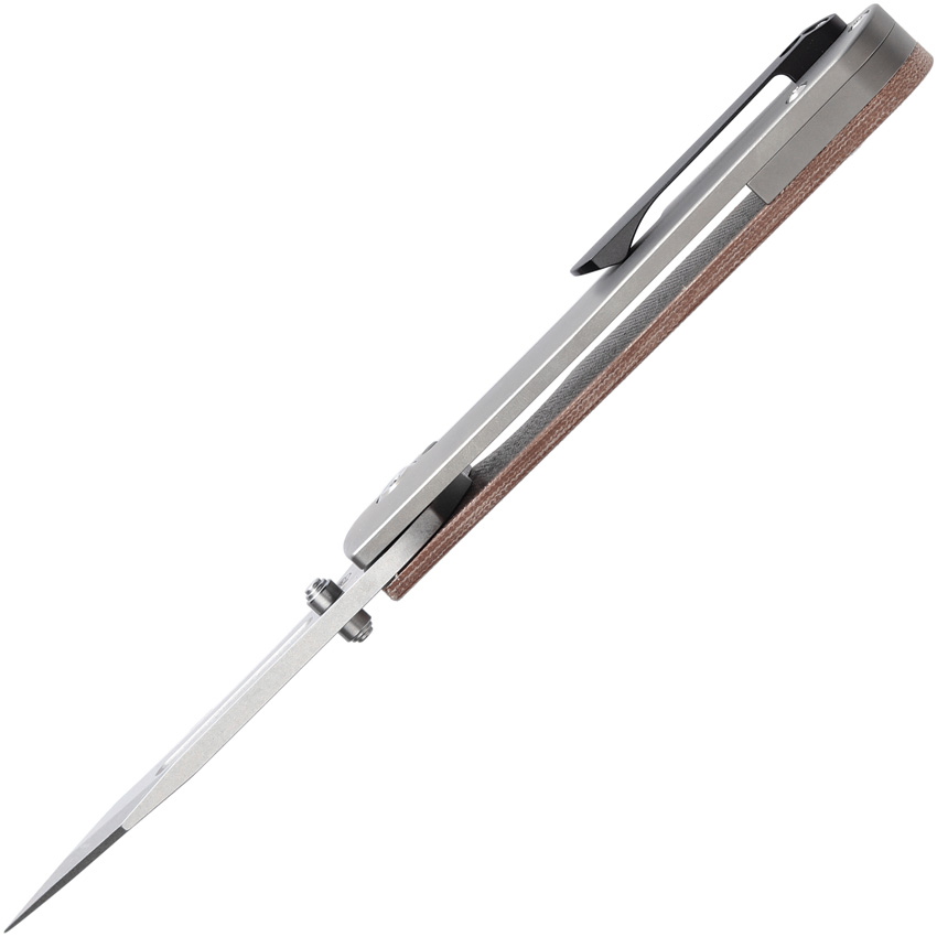 5.13″ (13.03cm) closed. 3.88″ (9.86cm) stonewash finish CPM S35VN stainless blade. Brown canvas micarta handle with titanium back handle. Extended tang. Thumb stud. Pocket clip. Black nylon zippered storage case. Boxed.