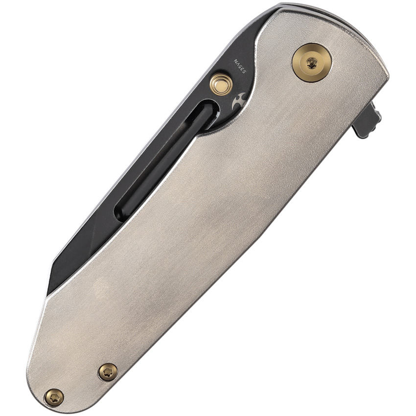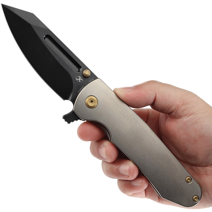 5.13″ (13.03cm) closed. 3.88″ (9.86cm) BlackWash finish CPM S35VN stainless Wharncliffe blade. Orange peel titanium handle. Extended tang. Thumb stud. Pocket clip. Black nylon zippered storage case. Boxed.