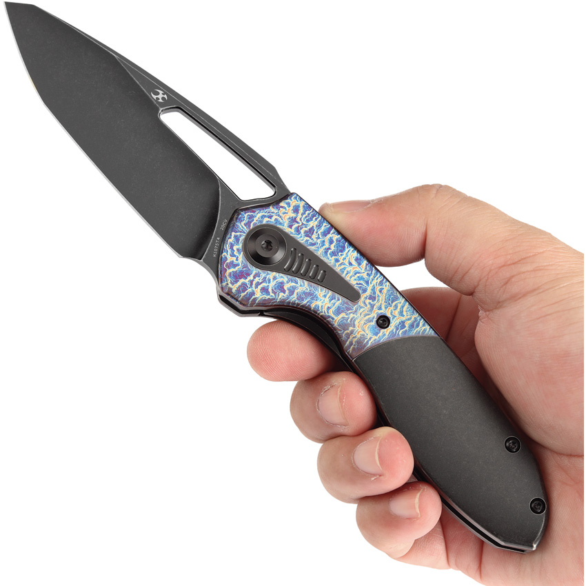 4.63″ (11.76cm) closed. 3.38″ (8.59cm) black stonewash finish CPM-20CV stainless clip point blade. Black stonewash finish titanium handle with Lightning strike anodized titanium inlay. Thumb pull. Pocket clip. Black nylon pouch. Boxed.