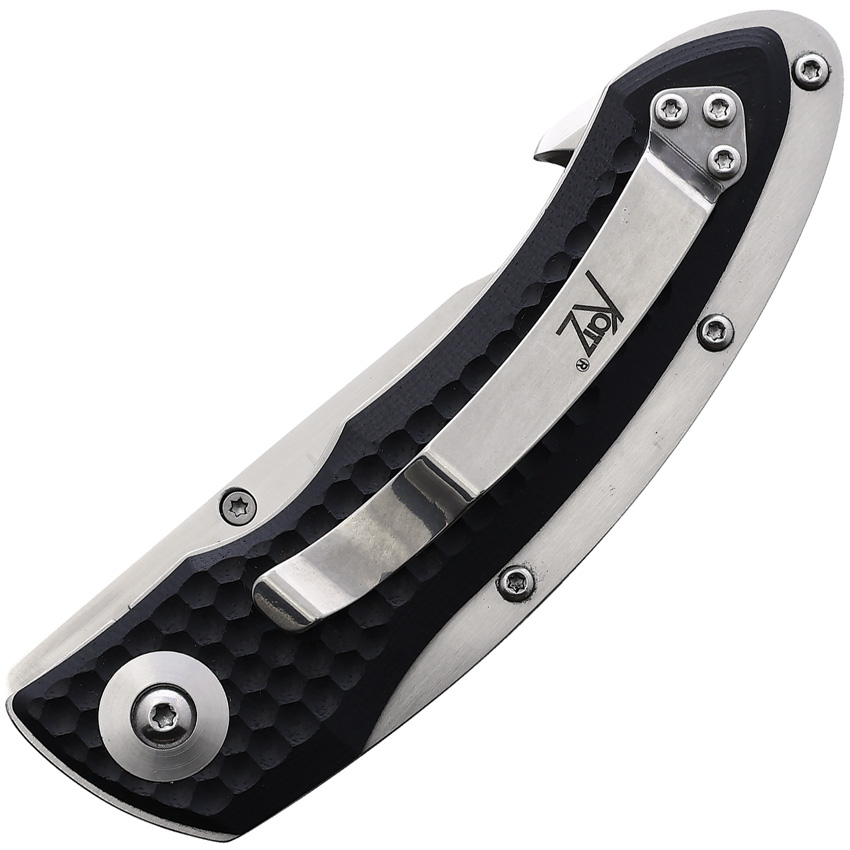 4.63″ (11.76cm) closed. 3.5″ (8.89cm) satin finish 9Cr18MoV stainless guthook blade. Black sculpted G10 handle. Thumb stud. Pocket clip. Boxed.