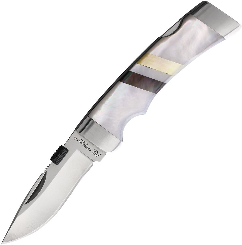 3.88″ (9.86cm) closed. 2.88″ (7.32cm) satin finish stainless drop point blade. Mother of pearl handle. Stainless bolster(s). Thumb disk. Brown leather belt sheath. Boxed.
