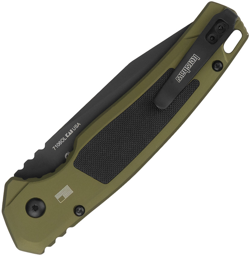 Automatic opening. 5″ (12.7cm) closed. 3.5″ (8.89cm) black PVD coated CPM-M4 stainless drop point blade. OD green anodized aluminum handle with black G10 insert. Lanyard hole. Pocket clip. Boxed.