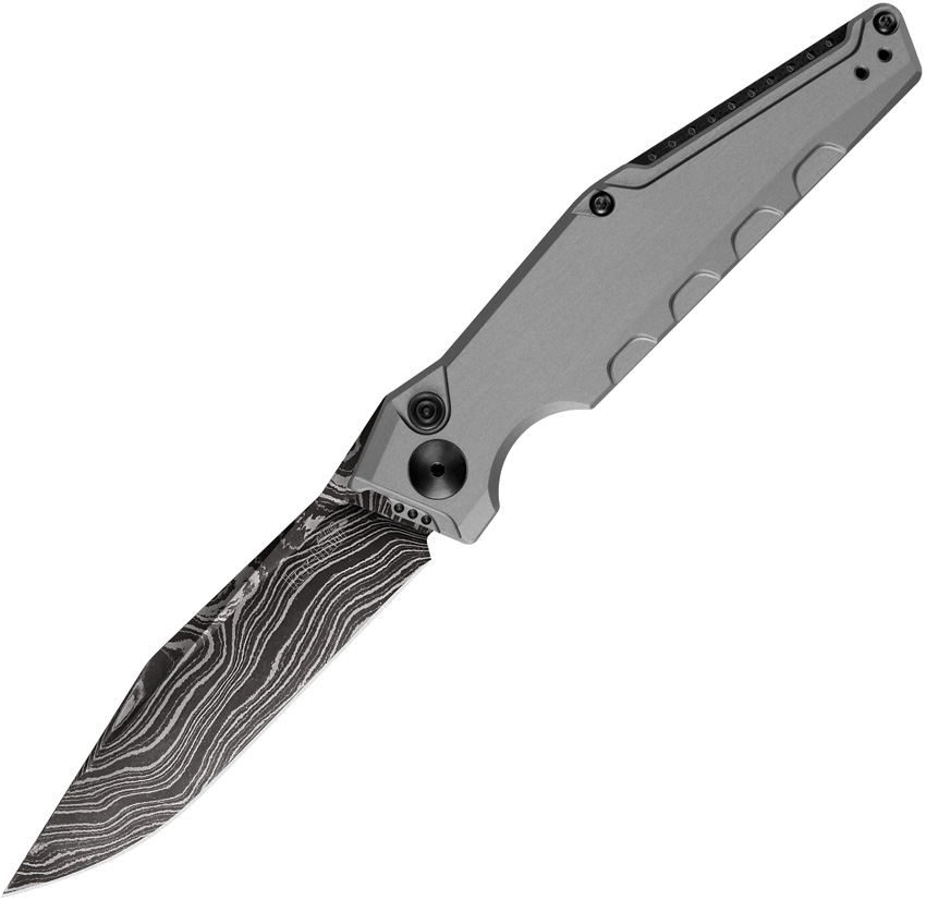 Automatic opening. 5″ (12.7cm) closed. 3.75″ (9.53cm) Damascus steel blade. Gray anodized aluminum handle. Pocket clip. Boxed.
