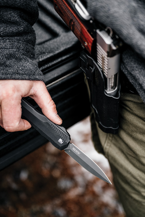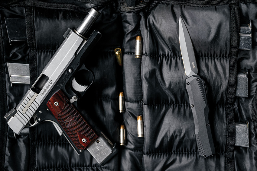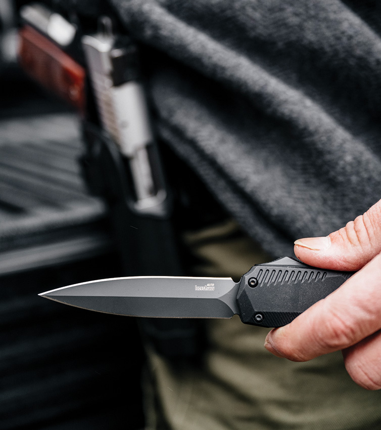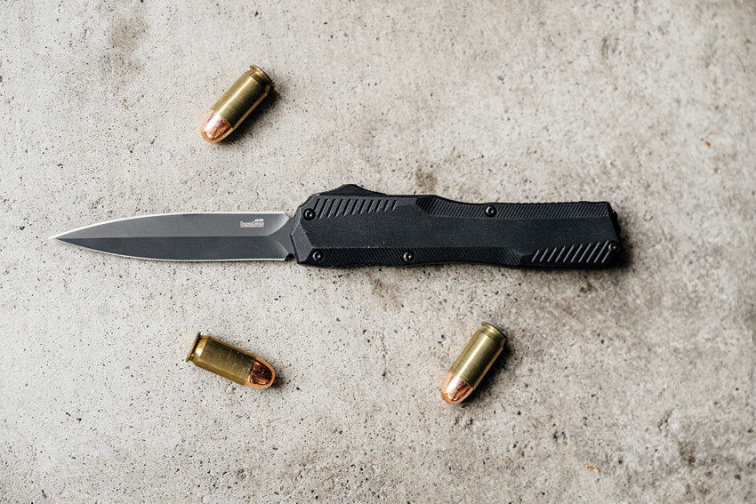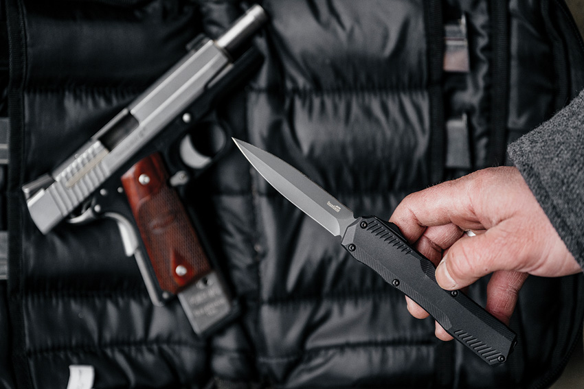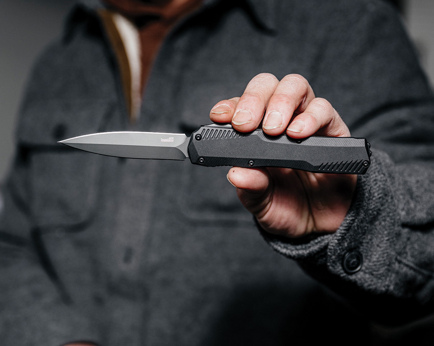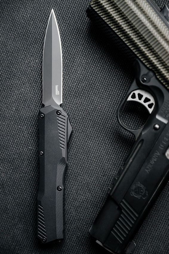 Automatic opening. 4.88″ (12.4cm) closed. 3.25″ (8.26cm) black PVD coated double edge CPM MagnaCut stainless spear point blade. Black anodized aluminum handle. Pocket clip. Designed by Matt Diskin. Boxed.