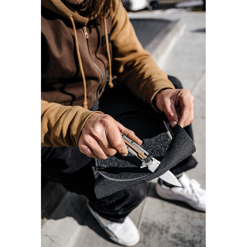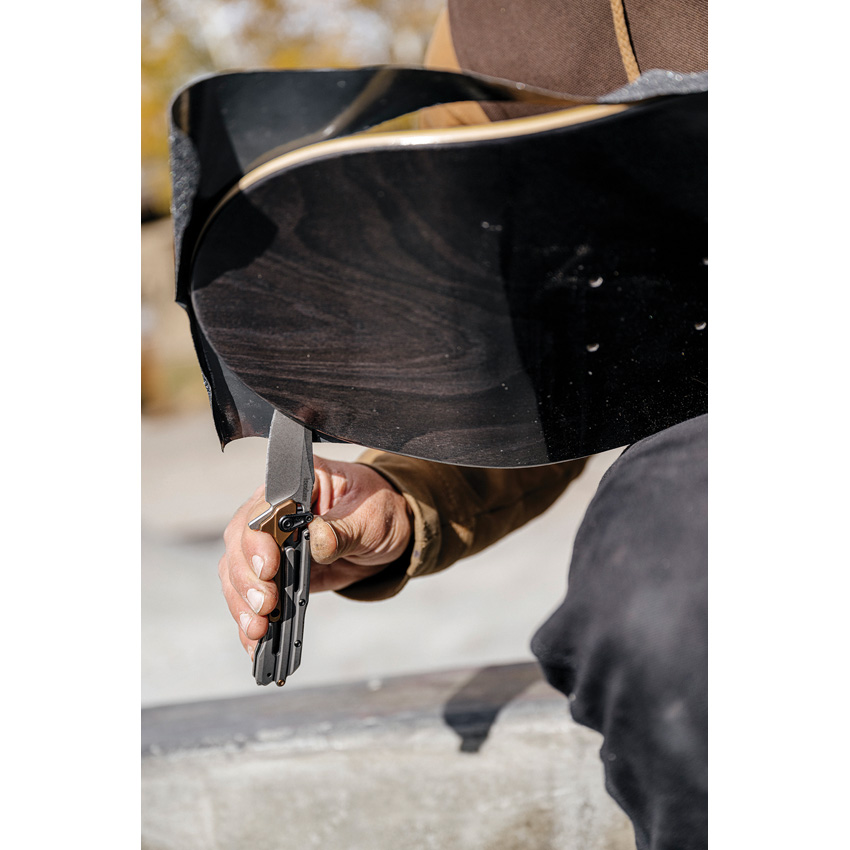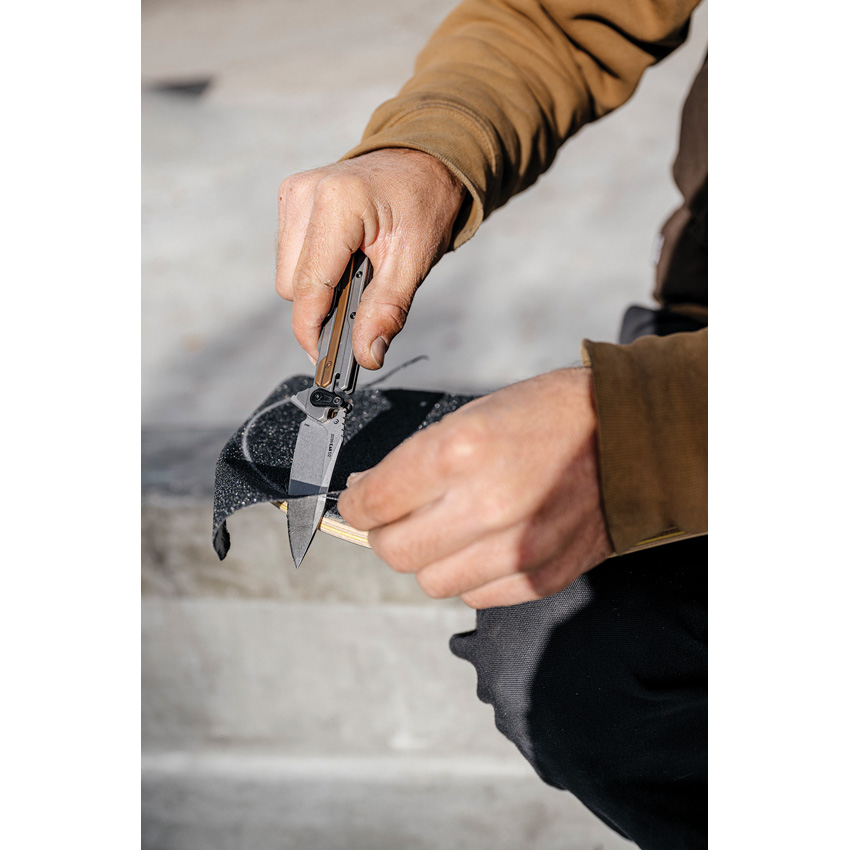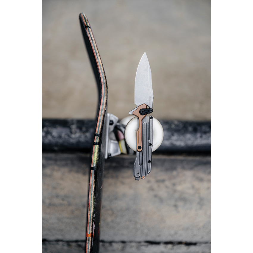 4.25″ (10.8cm) closed. 3″ (7.62cm) stonewash finish D2 tool steel blade. Gray and bronze PVD coated stainless handle. Extended tang. Pocket clip. Manual KVT ball bearings. Boxed.
