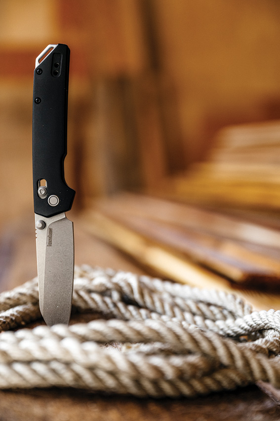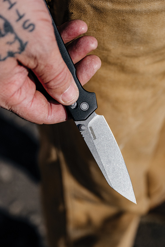 4.5″ (11.43cm) closed. 3.5″ (8.89cm) stonewash finish D2 tool steel blade. Black anodized aluminum handle. Thumb stud. Lanyard hole. Pocket clip. Reverse tanto blade. Boxed.