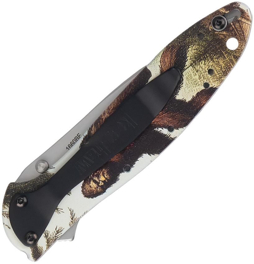 Assisted opening. 4″ (10.16cm) closed. 3″ (7.62cm) bead blast finish Sandvik 14C28N stainless blade. Aluminum handle. Extended tang. Thumb stud. Pocket clip. Lanyard hole. Big Foot handle artwork. Boxed.
