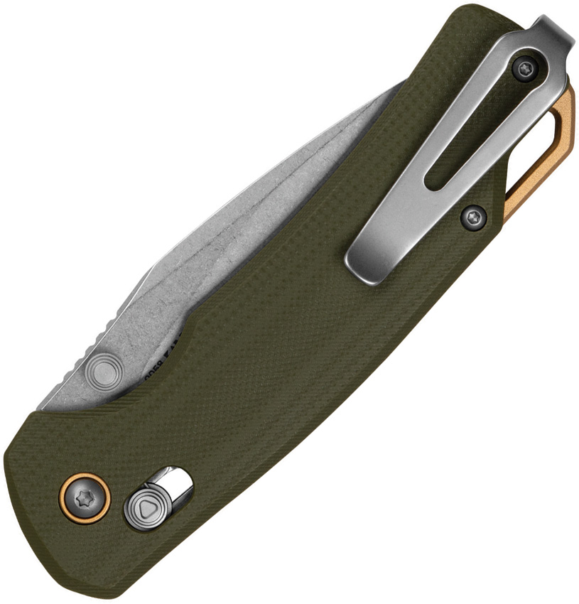 4.38″ (11.13cm) closed. 3.13″ (7.95cm) stonewash finish D2 tool steel drop point blade. Olive G10 handle. Thumb stud. Lanyard hole. Pocket clip. Gold anodized aluminum trim rings and backspacer. Boxed.