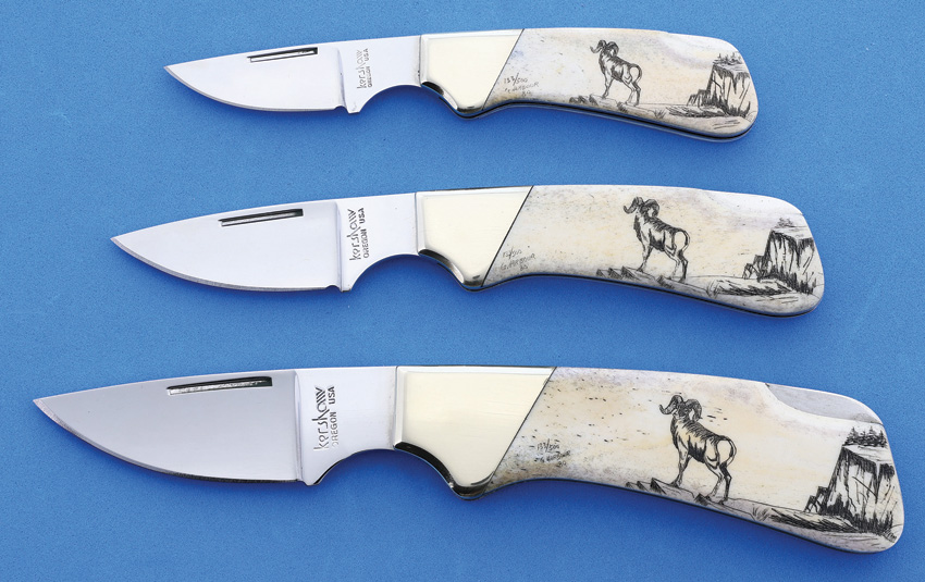 Kershaw Scrimshaw Ram Set. Includes 2 5/8” closed, 3 1/8” closed and 3 7/8” closed single blade lockbacks. Mirror polished surgical steel drop point blades. Smooth bone handles feature hand scrimshaw of rams by G. Harbour. Single brass bolsters. Serial numbered. Produced in Japan in 1980. Wood display case with vacuum formed insert.