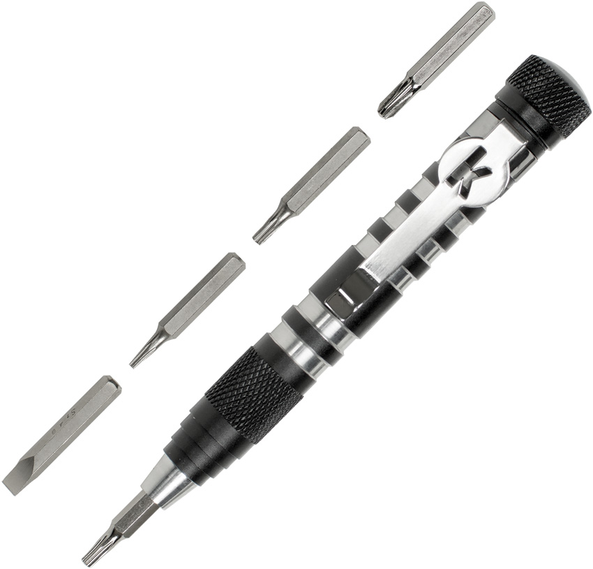 4.25″ overall. Black aluminum handles. Magnetic driver tip. Stainless bits include: T6, T8, T10, Phillips, and slotted screwdriver bits. Bits store in handle. Pocket clip. Boxed.
