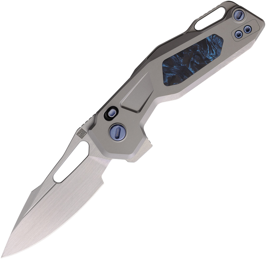 4″ (10.16cm) closed. 3″ (7.62cm) satin finish Bohler M390 stainless blade. Gray titanium handle with Blue marble carbon fiber inlay. Extended tang. Thumb pull. Lanyard hole. Pocket clip. Boxed.