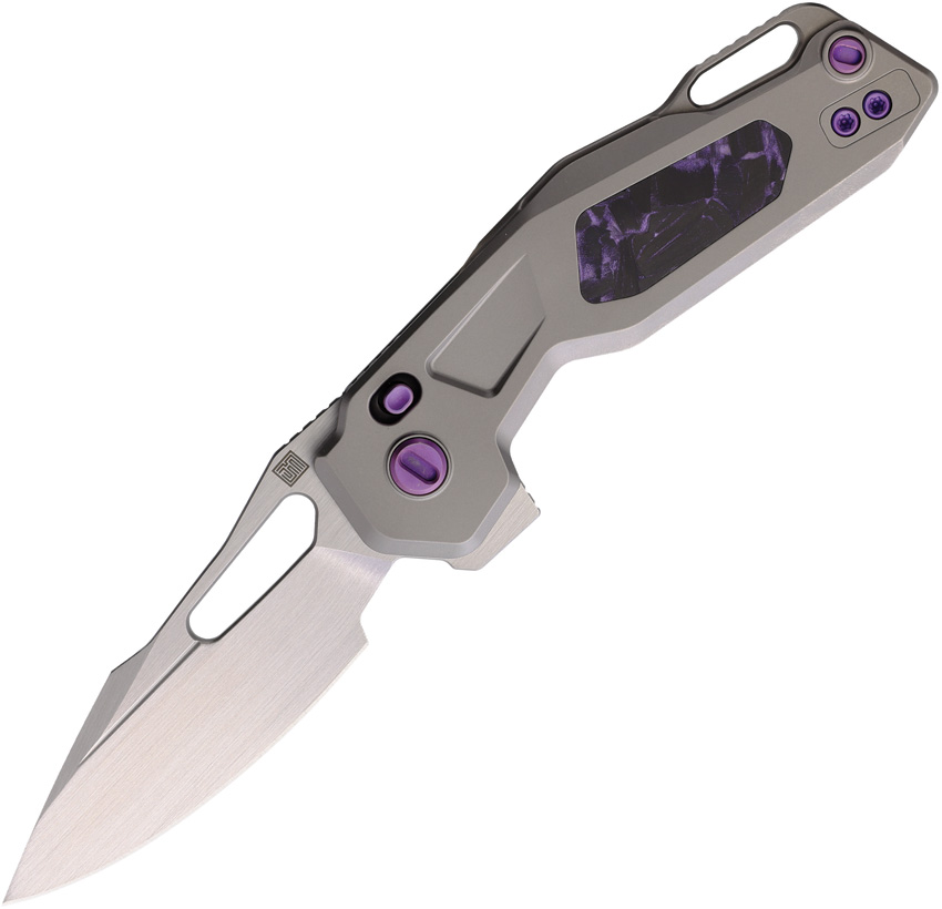 4″ (10.16cm) closed. 3″ (7.62cm) satin finish Bohler M390 stainless blade. Gray titanium handle with Purple marble carbon fiber inlay. Extended tang. Thumb pull. Lanyard hole. Pocket clip. Boxed.