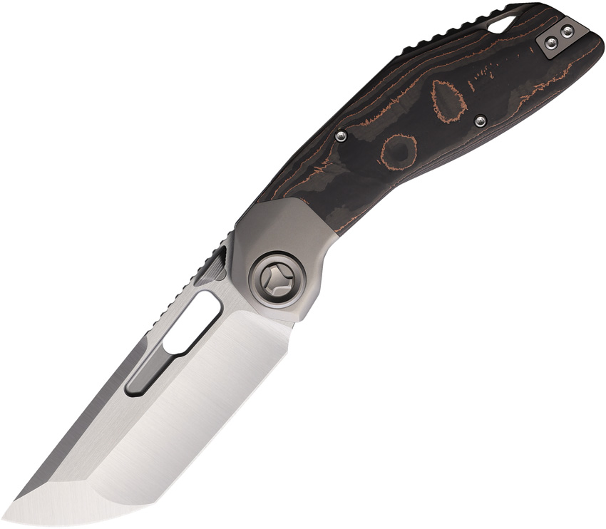 4.5″ (11.43cm) closed. 3.25″ (8.26cm) satin finish Bohler M390 stainless tanto blade. Copper Foil carbon fiber handle. Titanium bolster(s). Thumb disk. Thumb pull. Lanyard hole. Pocket clip. Extended tang. Boxed.