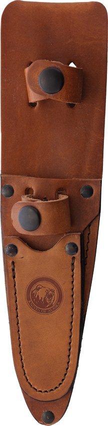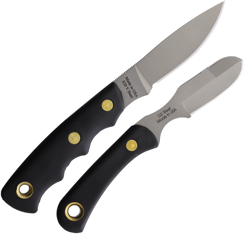 Bead blast finish S30V stainless blade. Black SureGrip handle. Full tang. Lanyard hole. Includes: 8″ overall alpha wolfe with 3″ blade; 6.5″ overall muskrat with 2.25″ blade with sharpened top edge. Brown leather belt sheath.