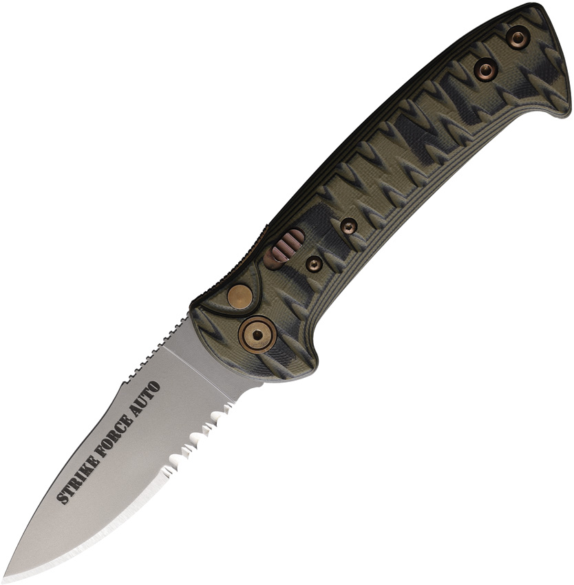 Automatic opening. 4.63″ (11.76cm) closed. 3.25″ (8.26cm) bead blast finish partially serrated D2 tool steel blade. OD green and black G10 handle. Pocket clip. Manual safety. Boxed.