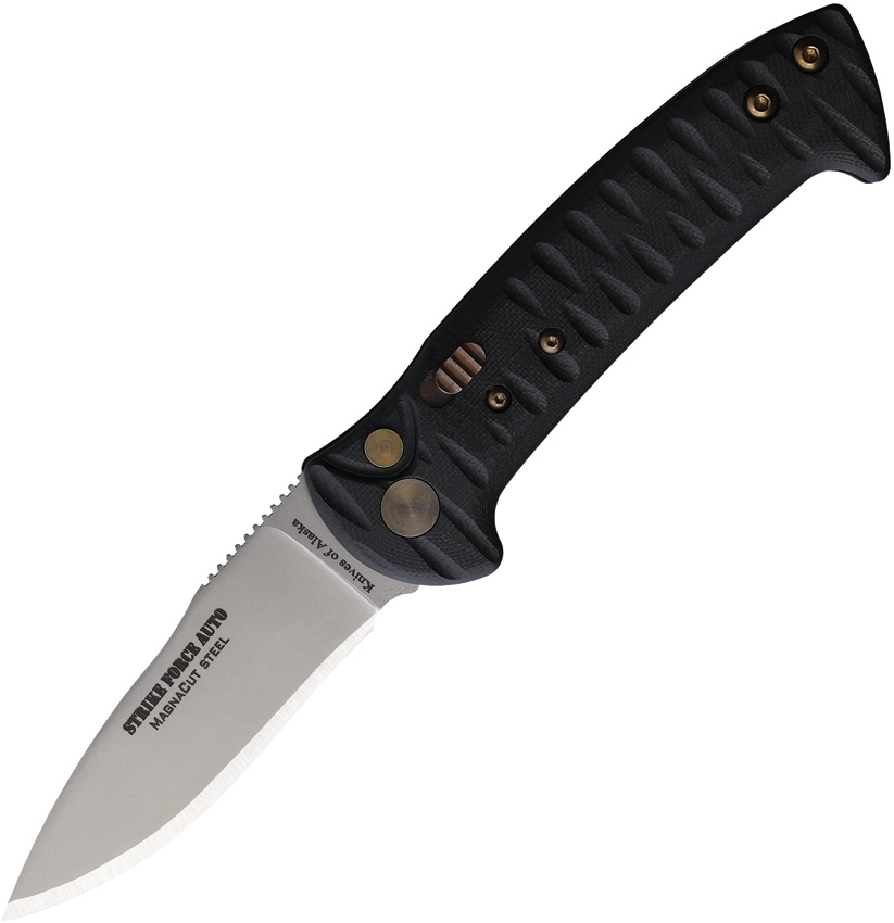 Automatic opening. 4.63″ (11.76cm) closed. 3.25″ (8.26cm) bead blast finish MagnaCut steel blade. Black sculpted G10 handle. Pocket clip. Boxed.