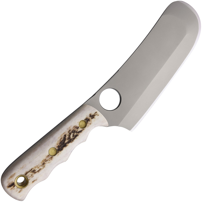 10.5″ (26.67cm) overall. 6″ (15.24cm) bead blast finish D2 tool steel blade. Finger grooved stag handle. Full tang. Lanyard hole. Sharpened, round end. Brown leather belt sheath. Boxed.