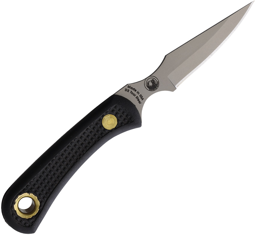 6.75″ (17.15cm) overall. 2.5″ (6.35cm) bead blast finish D2 tool steel blade. Black SureGrip handle. Full tang. Lanyard hole. Brown leather belt sheath. Boxed.