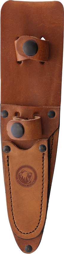 Bead blast finish D2 tool steel blade. Orange SureGrip handle. Full tang. Lanyard hole. Includes: 8.25″ overall Jaeger with 3.25″ blade; 6.75″ overall Muskrat with 2.25″ blade with sharpened top edge. Brown leather belt sheath. Boxed.