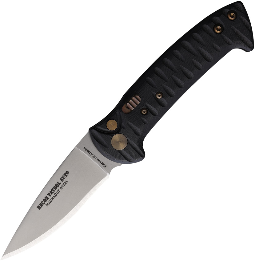 Automatic opening. 4.75″ (12.07cm) closed. 3.5″ (8.89cm) bead blast finish MagnaCut steel blade. Black sculpted G10 handle. Pocket clip. Boxed.