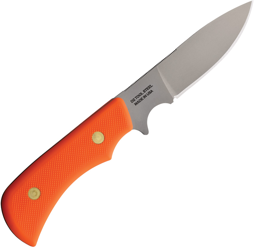 8.5″ (21.59cm) overall. 3.25″ (8.26cm) bead blast finish D2 tool steel blade. Orange SureGrip handle. Full tang. Brown leather belt sheath. Boxed.