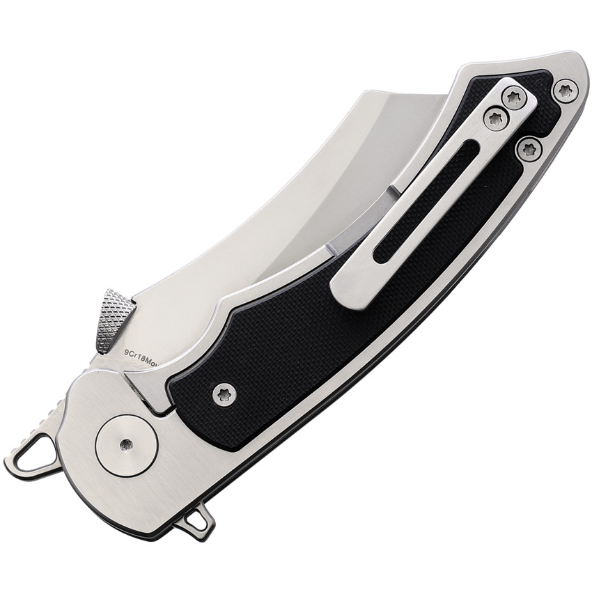 5.25″ (13.34cm) closed. 3.75″ (9.53cm) satin finish 9Cr18MoV stainless blade. Stainless handle with black G10 inlay. Thumb disk. Extended tang. Pocket clip. Copper backspacer. Boxed.