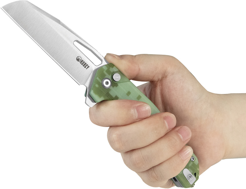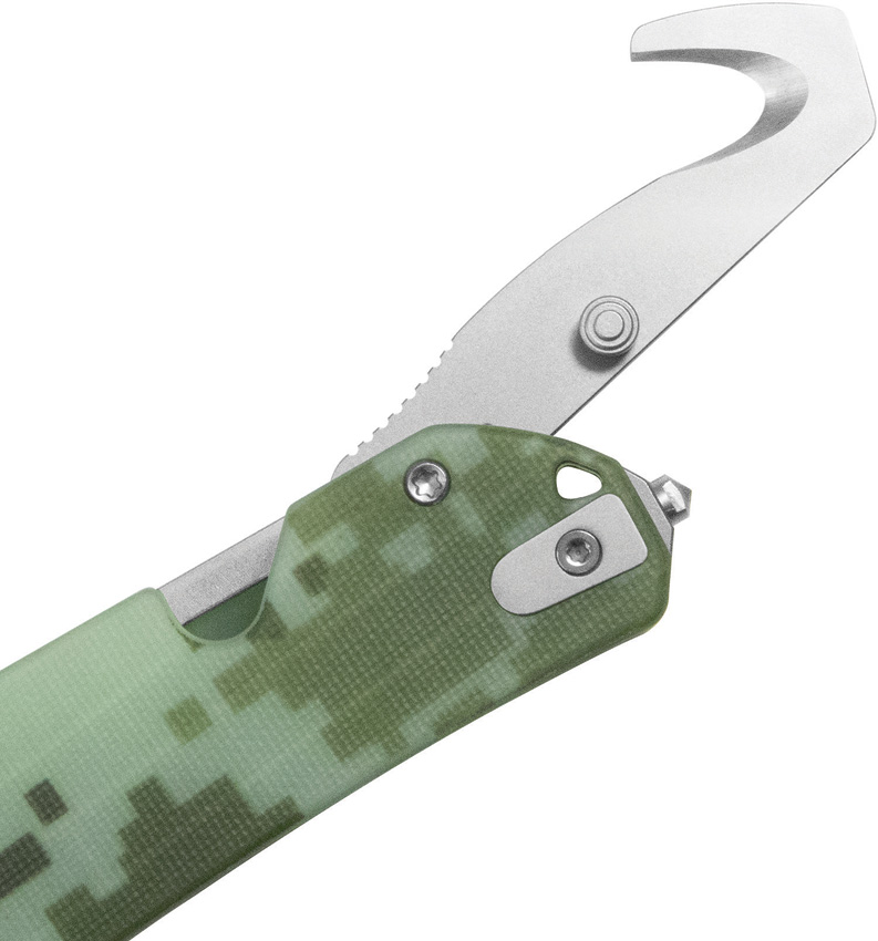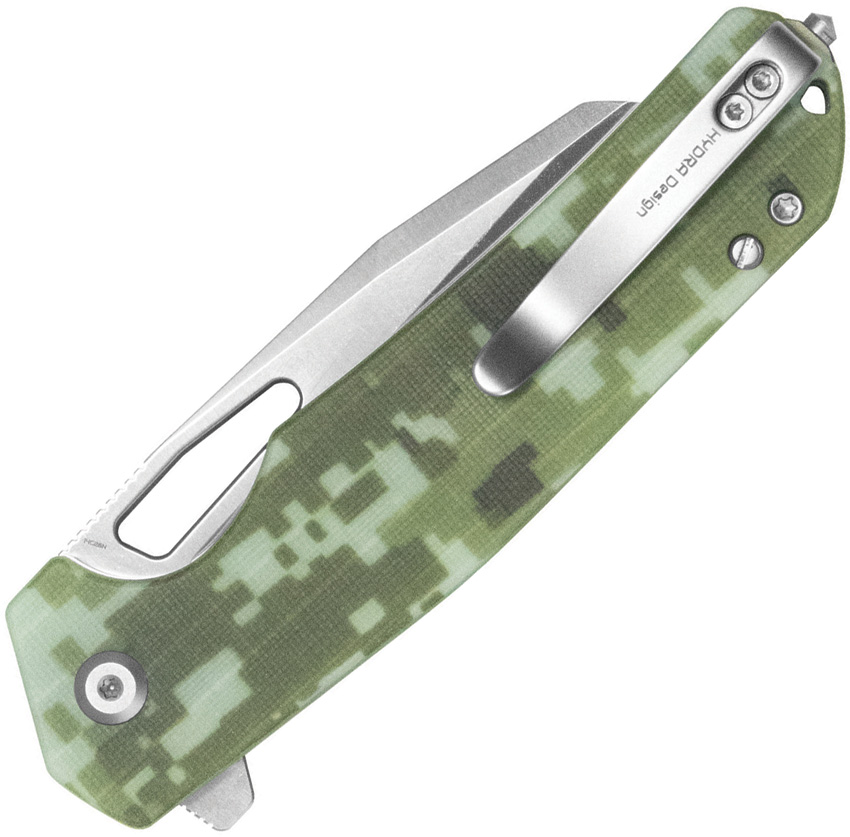 4.75″ (12.07cm) closed. 3.13″ (7.95cm) satin finish 14C28N Sandvik stainless sheepsfoot blade. Digital camo G10 handle. Belt/cord cutter. Glass breaker. Lanyard hole. Pocket clip. Extended tang. Thumb pull. Boxed.
