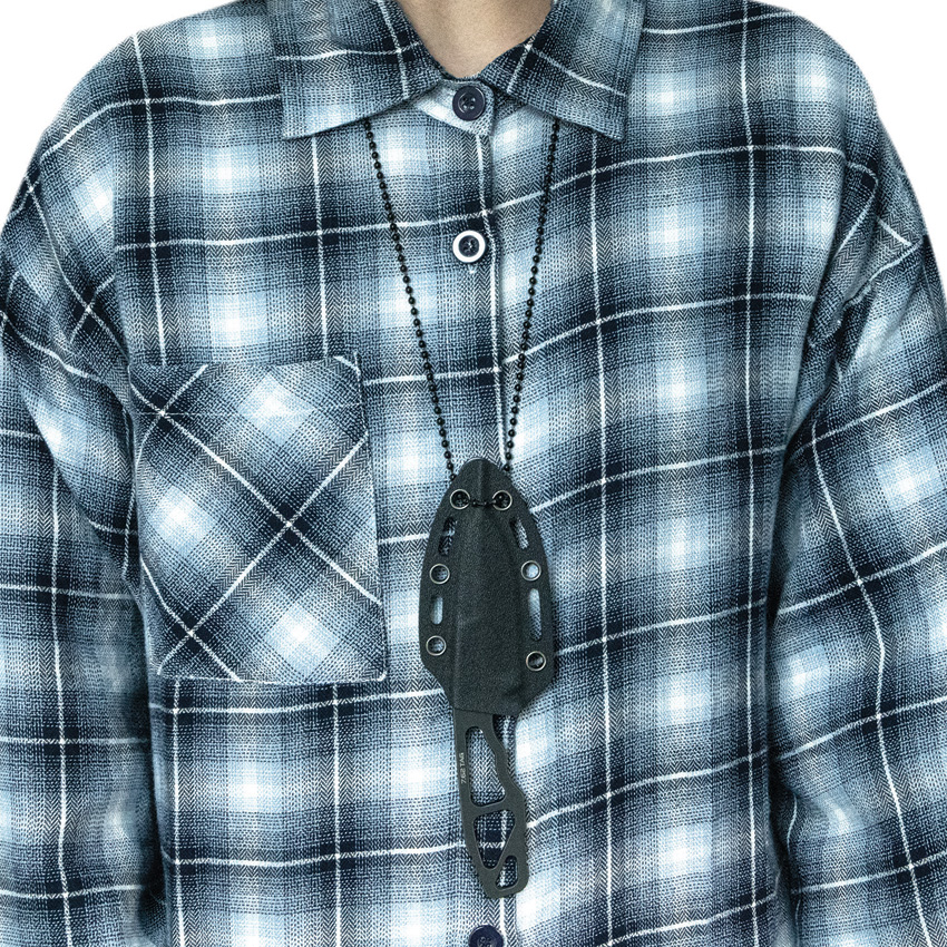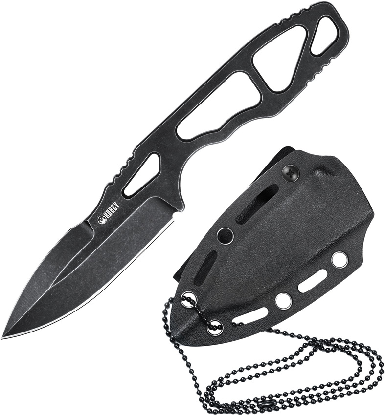7.63″ (19.38cm) overall. 3.13″ (7.95cm) black stonewash finish AUS-10A stainless blade. Skeletonized handle. One-piece construction. Black Kydex neck sheath. Boxed.