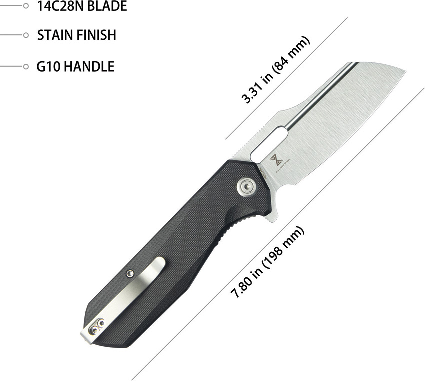 4.38″ (11.13cm) closed. 3.38″ (8.59cm) stonewash finish 14C28N Sandvik stainless blade. Black G10 handle. Extended tang. Thumb pull. Pocket clip. Boxed.