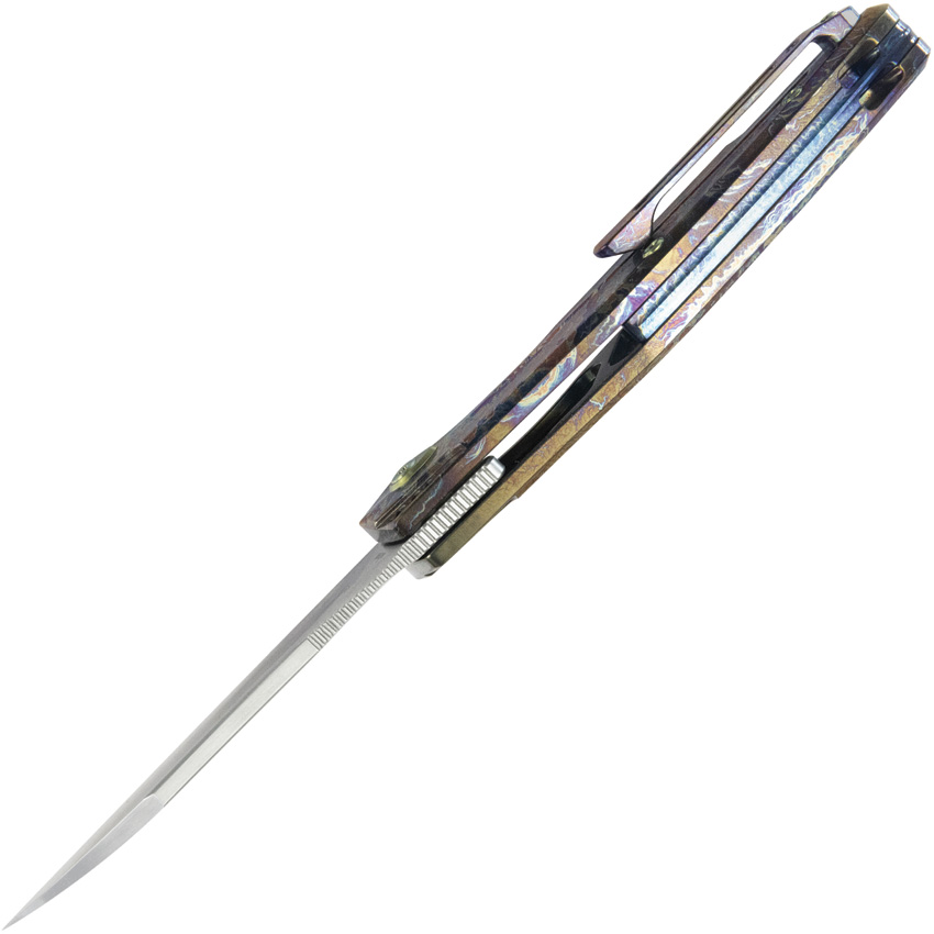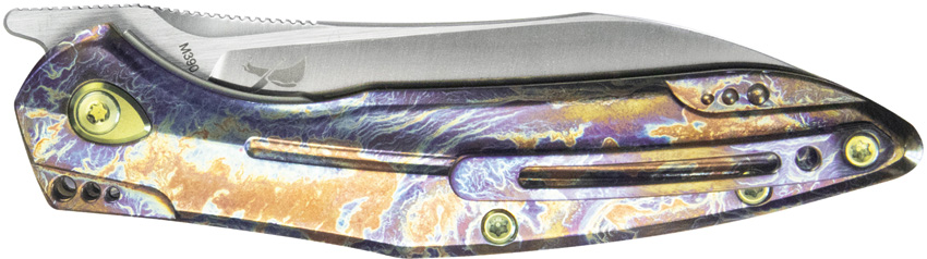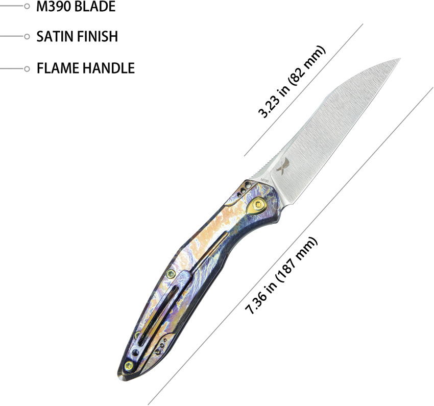 4″ (10.16cm) closed. 3.38″ (8.59cm) satin finish Bohler M390 stainless blade. Flamed titanium handle. Extended tang. Pocket clip. Boxed.