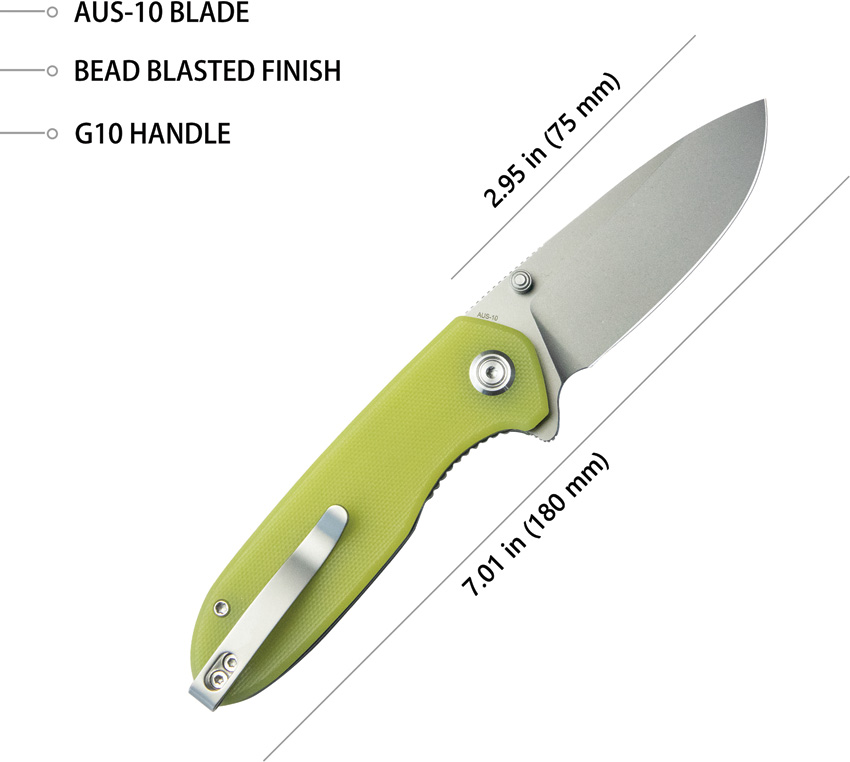 4″ (10.16cm) closed. 3″ (7.62cm) satin finish AUS-10A stainless blade. Yellow G10 handle. Extended tang. Pocket clip. Thumb stud. Boxed.