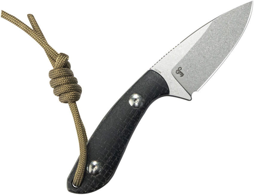 5.5″ (13.97cm) overall. 2.63″ (6.68cm) stonewash finish 14C28N Sandvik stainless drop point blade. Black micarta handle. Full tang. Lanyard hole. Black Kydex belt sheath. Boxed.