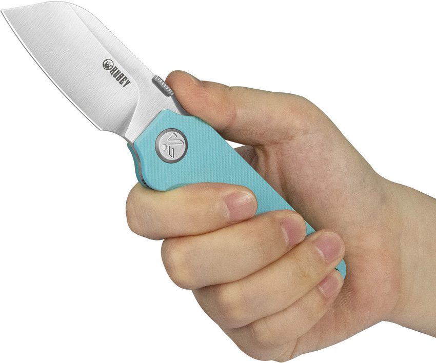 3.75″ (9.53cm) closed. 2.5″ (6.35cm) satin finish 14C28N Sandvik stainless sheepsfoot blade. Blue G10 handle. Thumb disk. Lanyard hole. Pocket clip. Extended tang. Boxed.