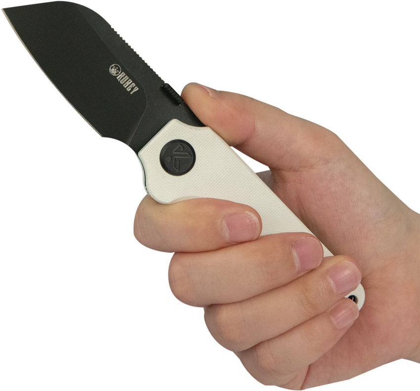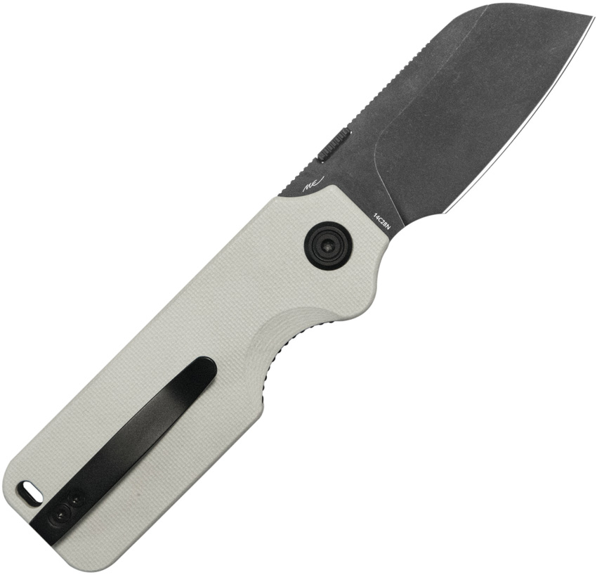3.75″ (9.53cm) closed. 2.5″ (6.35cm) BlackWash finish 14C28N Sandvik stainless sheepsfoot blade. White G10 handle. Thumb disk. Lanyard hole. Pocket clip. Extended tang. Boxed.