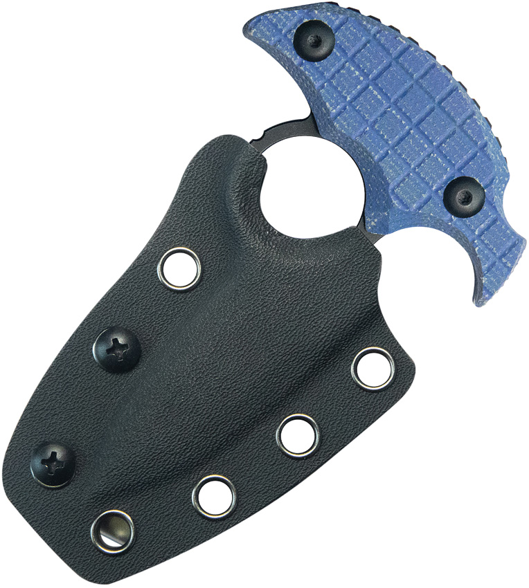 4.25″ (10.8cm) overall. 2.25″ (5.72cm) black stonewash finish double edge 14C28N Sandvik stainless spear point blade. Blue frag pattern G10 handle. Finger ring. Full tang. Black Kydex belt sheath. Boxed.