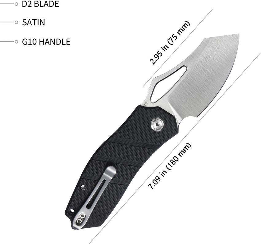 4.13″ (10.49cm) closed. 2.95″ (7.49cm) satin finish D2 tool steel modified tanto blade. Black G10 handle. Thumb pull. Lanyard hole. Pocket clip. Boxed.