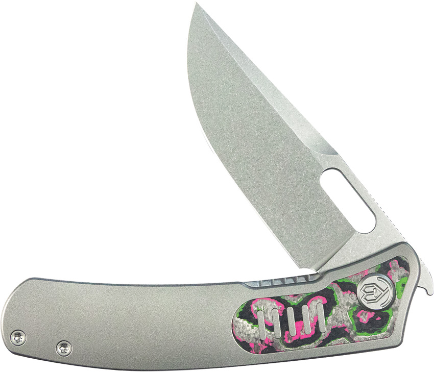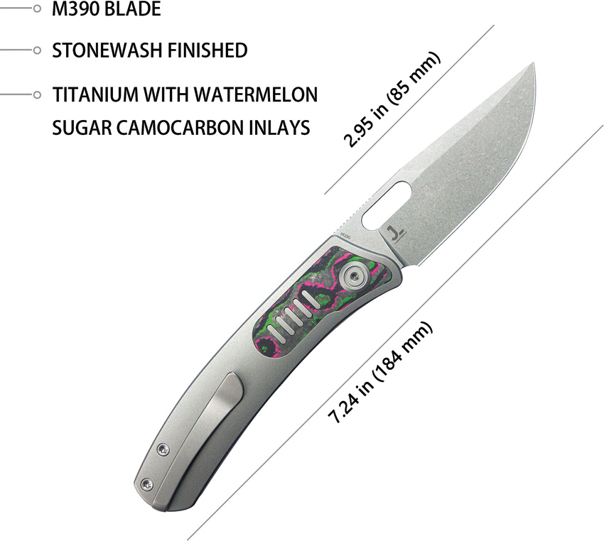 4.13″ (10.49cm) closed. 3.13″ (7.95cm) satin finish Bohler M390 stainless blade. Gray titanium handle with Watermelon Sugar carbon fiber inlay. Thumb pull. Pocket clip. Boxed.