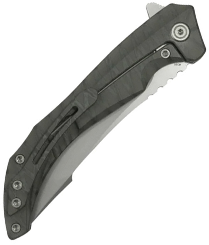 4.63″ (11.76cm) closed. 3.5″ (8.89cm) bead blast finish Bohler M390 stainless skinner blade. Flame sculpted titanium handle. Extended tang. Pocket clip. Boxed.