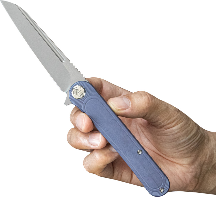 4.75″ (12.07cm) closed. 3.75″ (9.53cm) stonewash finish S90V steel blade. Blue titanium handle. Extended tang. Pocket clip. Boxed.