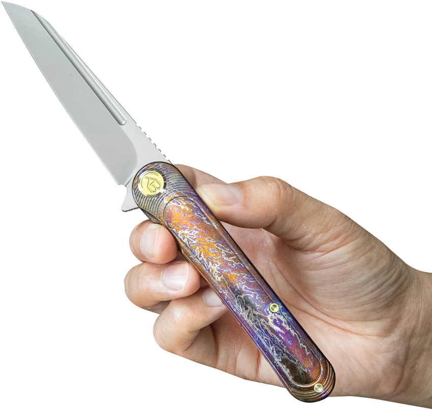 4.75″ (12.07cm) closed. 3.75″ (9.53cm) stonewash finish S90V steel blade. Flame anodized titanium handle. Extended tang. Pocket clip. Boxed.