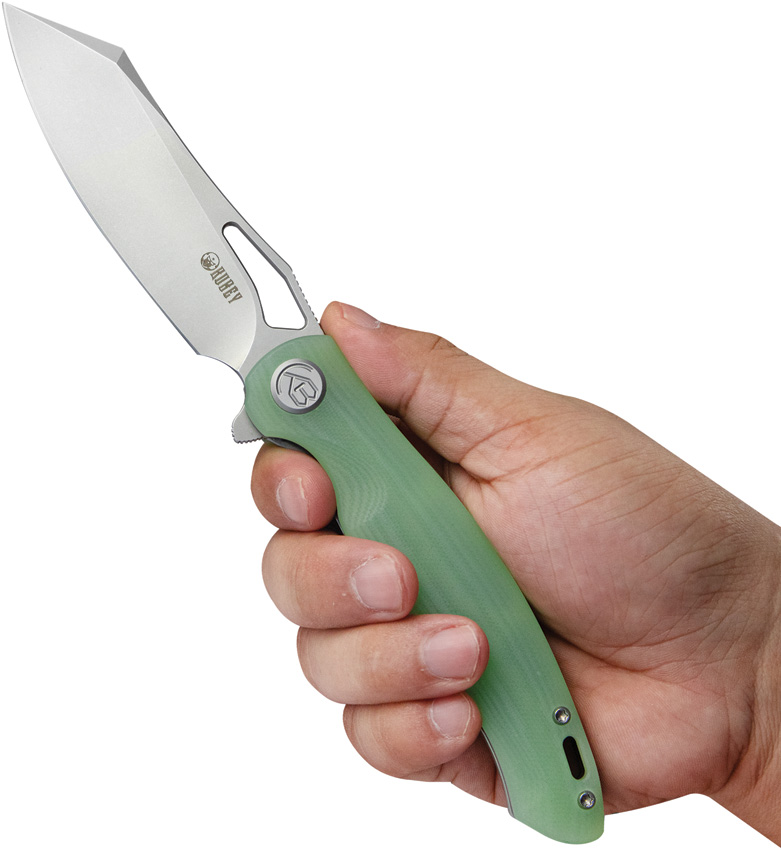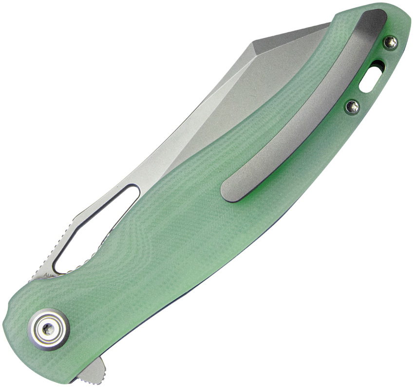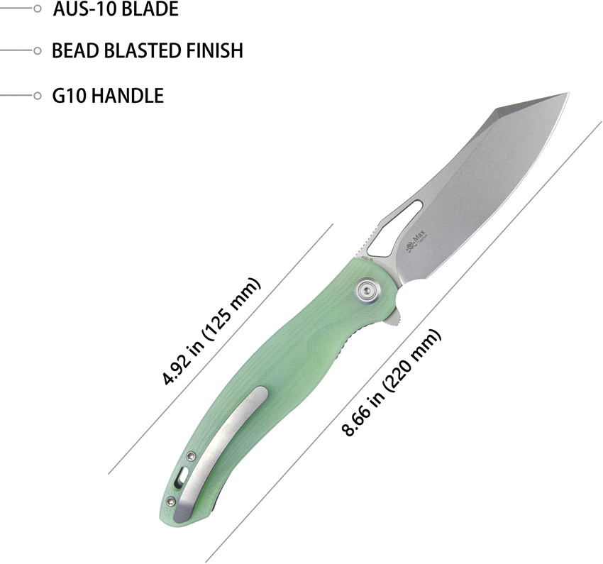 4.75″ (12.07cm) closed. 3.75″ (9.53cm) satin finish AUS-10A stainless blade. Jade G10 handle. Boxed.