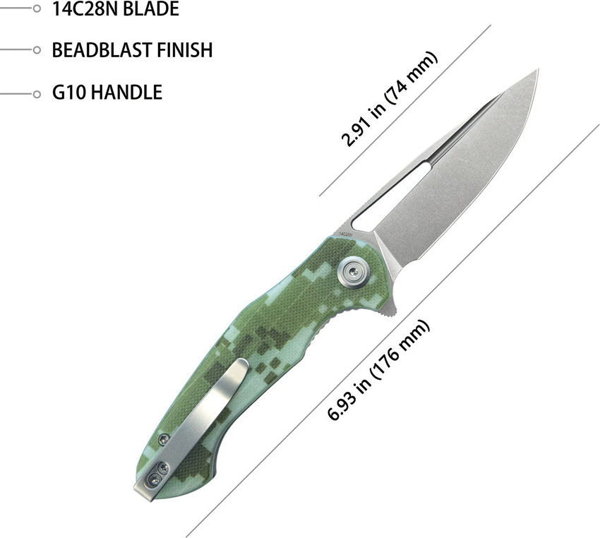 4″ (10.16cm) closed. 3″ (7.62cm) stonewash finish 14C28N Sandvik stainless blade. Digital camo G10 handle. Thumb pull. Extended tang. Pocket clip. Boxed.
