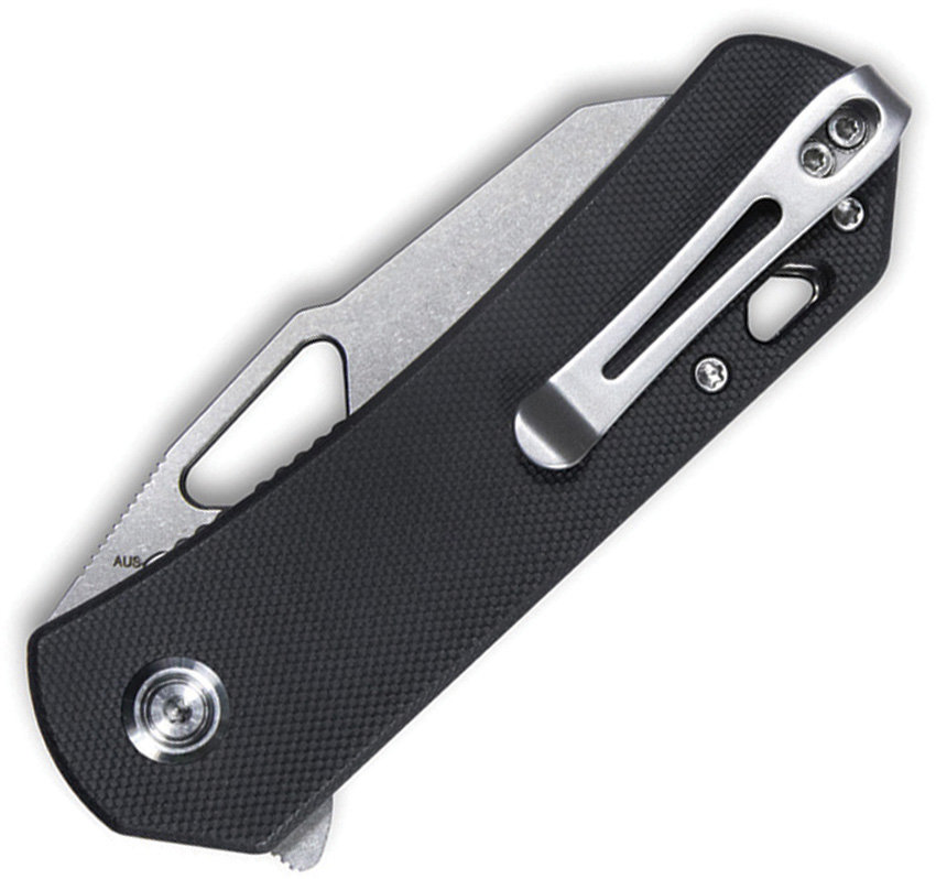 4″ (10.16cm) closed. 3″ (7.62cm) stonewash finish D2 tool steel sheepsfoot blade. Black G10 handle. Extended tang. Thumb pull. Lanyard hole. Pocket clip. Boxed.