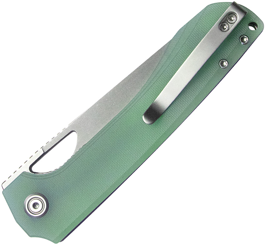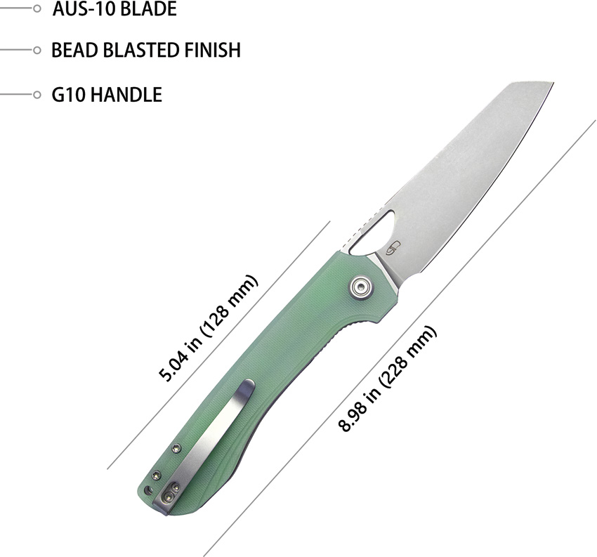 5″ (12.7cm) closed. 4″ (10.16cm) bead blast finish AUS-10A stainless sheepsfoot blade. Jade G10 handle. Thumb pull. Lanyard hole. Pocket clip. Boxed.