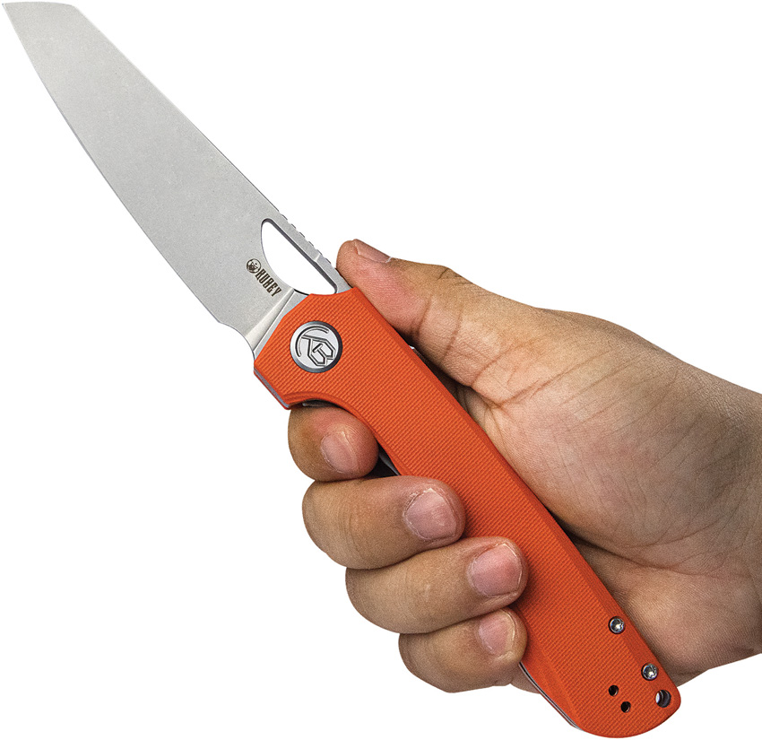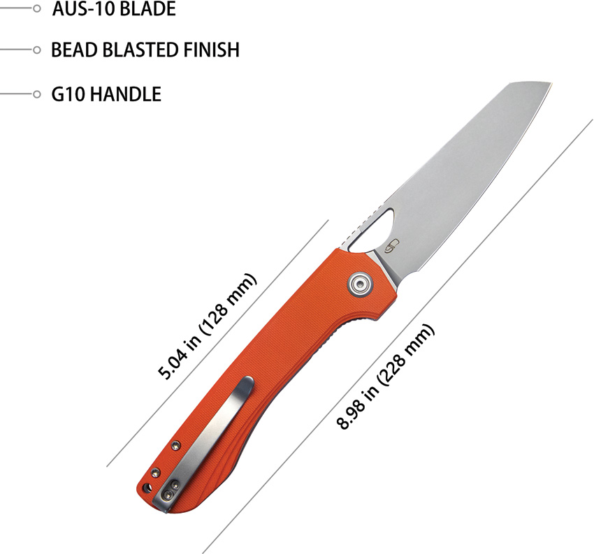 5″ (12.7cm) closed. 4″ (10.16cm) bead blast finish AUS-10A stainless sheepsfoot blade. Orange G10 handle. Thumb pull. Lanyard hole. Pocket clip. Boxed.