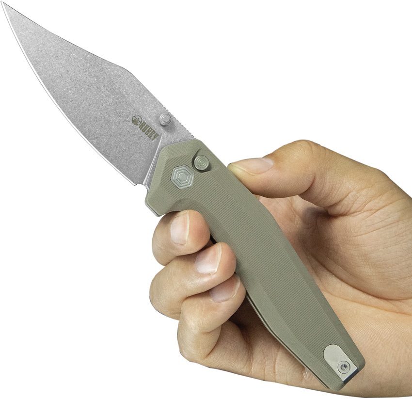 4.75″ (12.07cm) closed. 3.75″ (9.53cm) stonewash finish 14C28N Sandvik stainless clip point blade. Tan G10 handle. Thumb stud. Pocket clip. Boxed.
