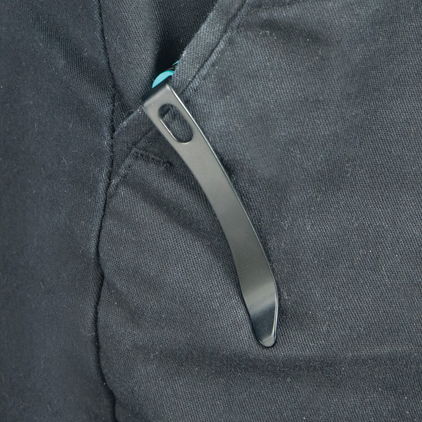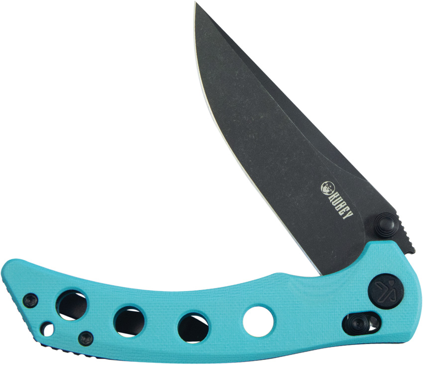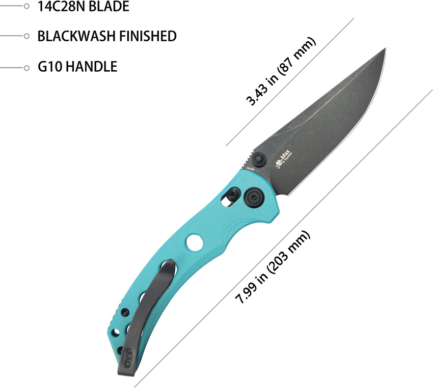 4.5″ (11.43cm) closed. 3.5″ (8.89cm) black stonewash finish 14C28N Sandvik stainless blade. Tiffany blue G10 handle. Thumb stud. Lanyard hole. Pocket clip. Boxed.